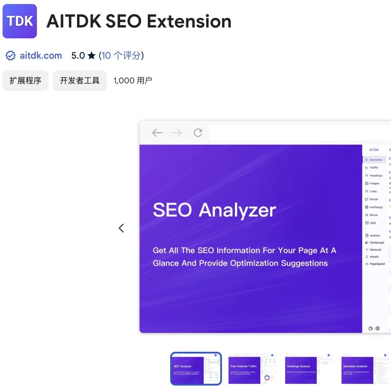 AITDK SEO Extension,一个集多功能于一身的浏览器插件,能帮你全面分析网页SEO信息,从标题、描述到图片标签,再到流量概览,一应俱全。想象一下,一个插件就能让你掌握网页的SEO全貌,是不是很酷?