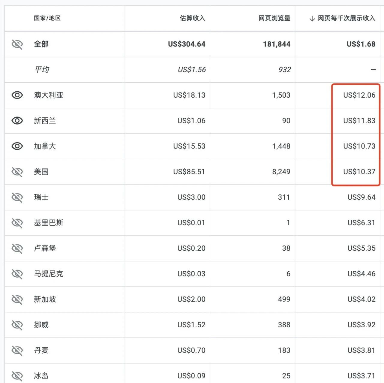 不同AI工具站的Adsense每千次展示收入在不同国家的表现各异,欧美发达国家通常更高,而视频和声音工具站的广告收入往往更可观。