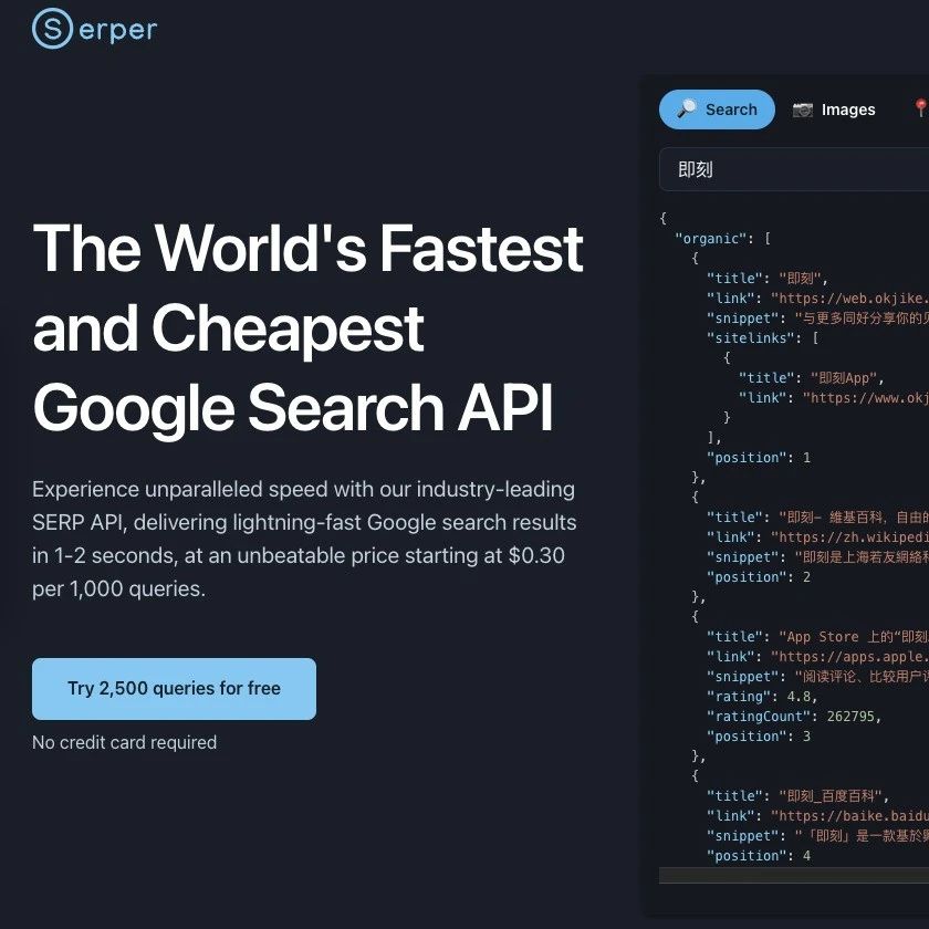 Serper.dev是一个无需注册即可体验的第三方谷歌搜索API,能够实时查询谷歌搜索结果,没有缓存。费用方面采用充值买点数,搜索扣点数的模式,最低充值50美元即可获得5万点,足够进行2.5万次搜索,获取250万个搜索结果。